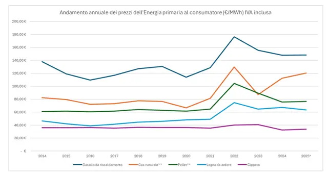 La solidità e la stabilità del prezzo dei combustibili legnosi, in modo molto particolare del cippato di legno, è molto interessante rispetto alla variazione dei prezzi medi annuali e degli andamenti pluriennali dei combustibili per il riscaldamento residenziale ed ai convenzionali combustibili fossili.